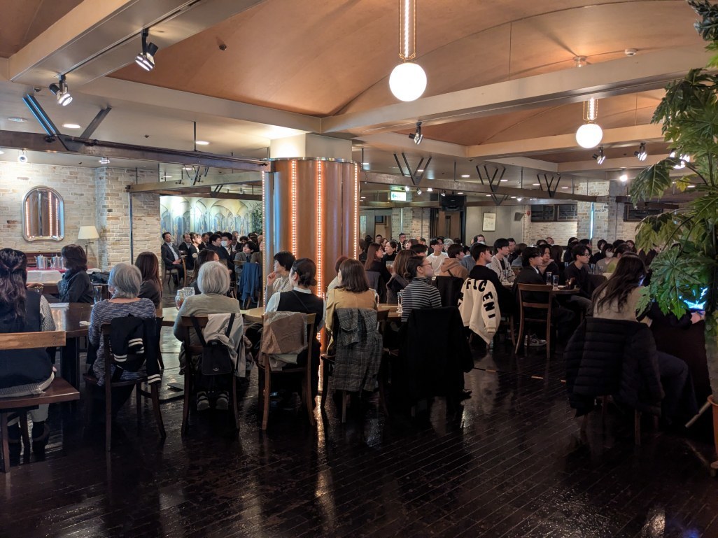 懇親会では店舗を超えて親交を深める姿も見られました。最後は若手社員の呼びかけで「頑張ろう!」